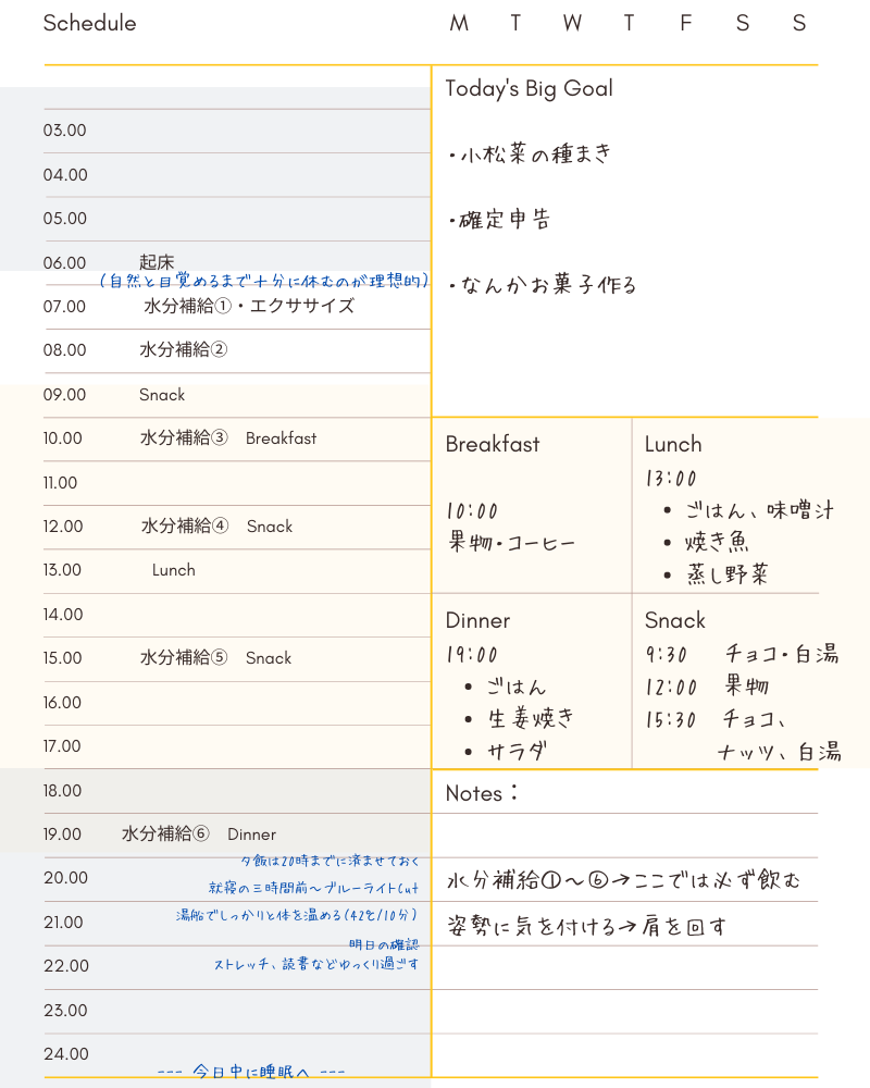 ブルーで塗った時間帯は穏やかに過ごす時間。逆に黄色く塗っている時間帯は食事をしたり、活発に過ごすようにします。